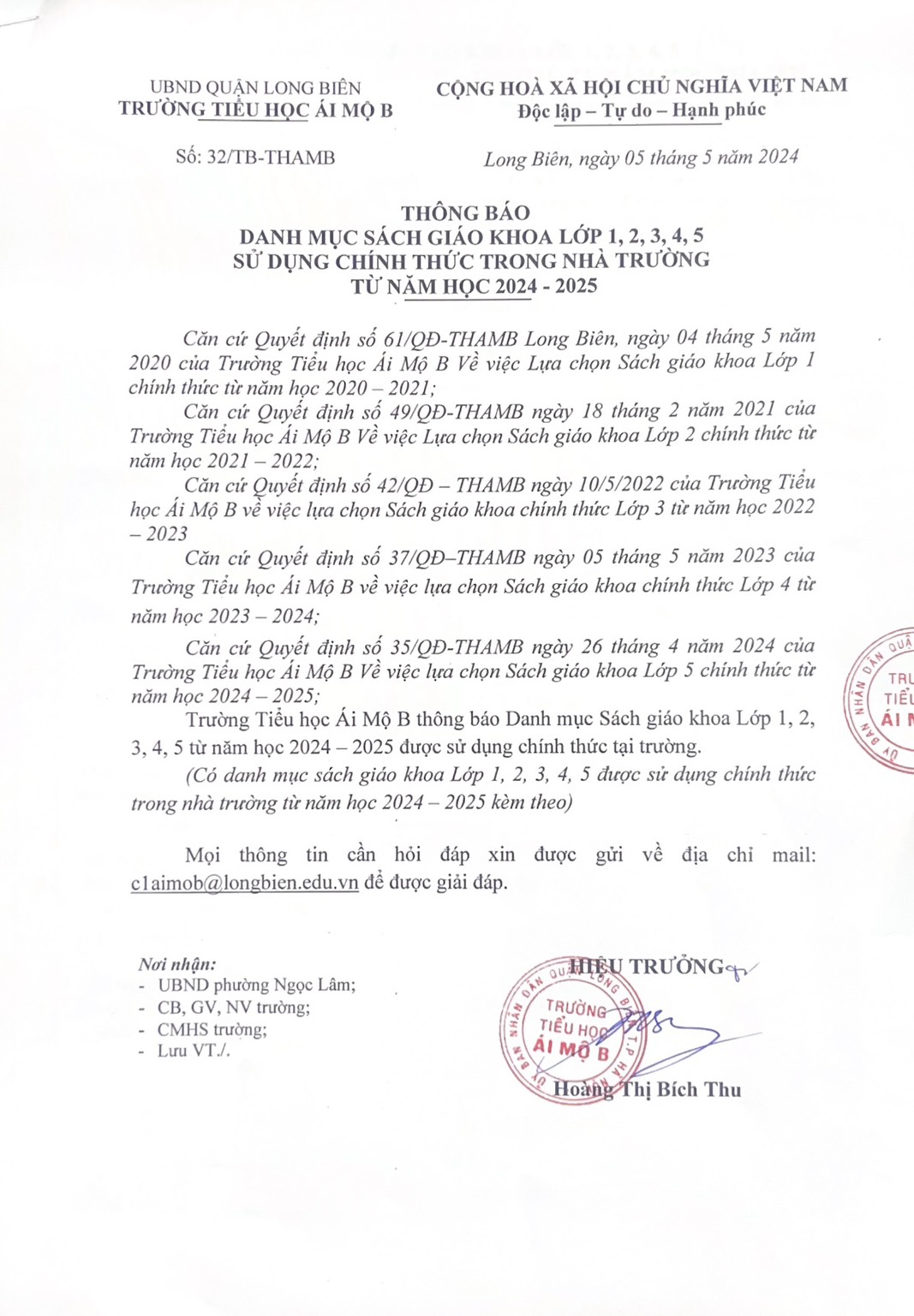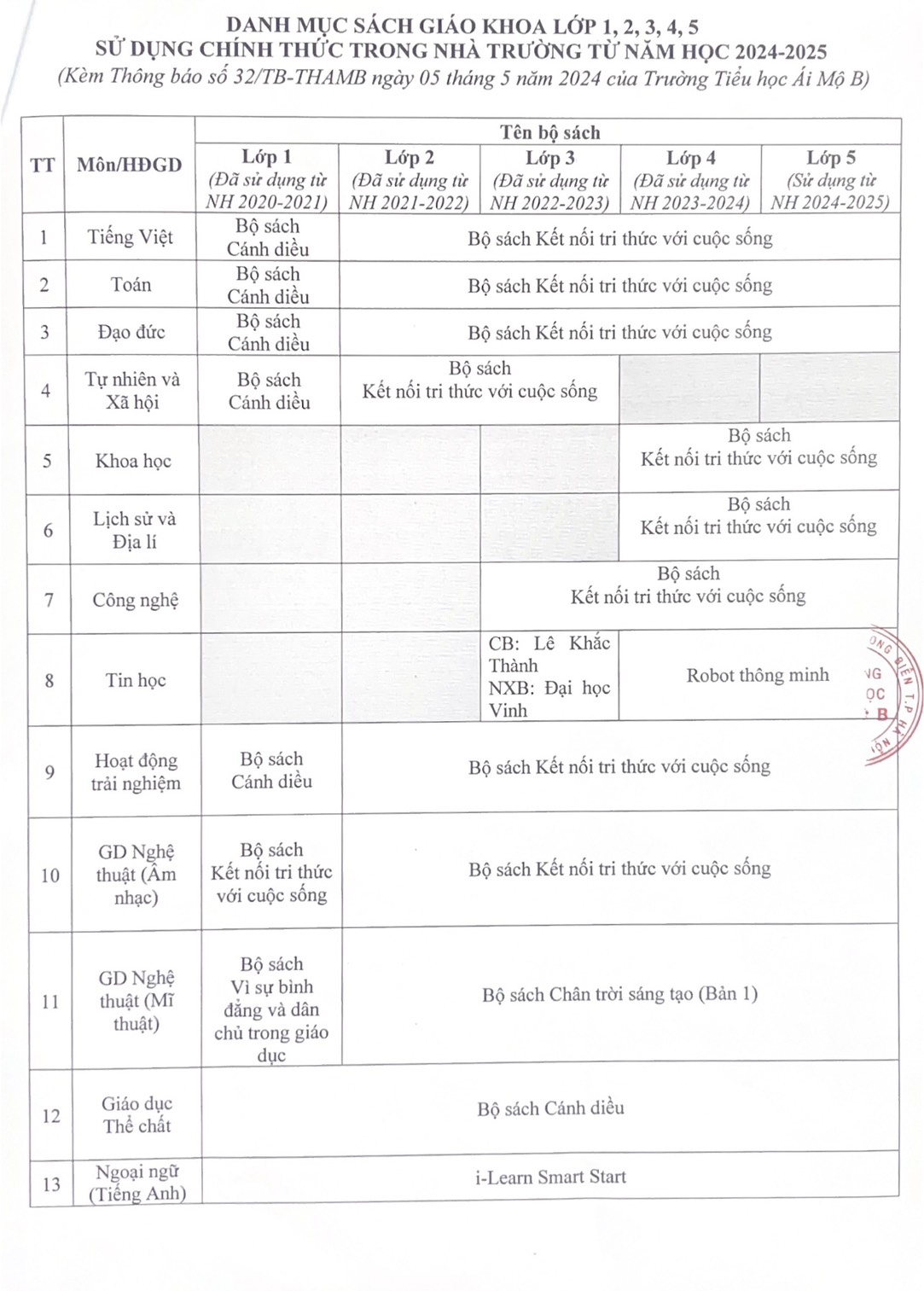 Thông báo danh mục Sách giáo khoa Lớp 1, 2, 3, 4, 5 sử dụng chính thức trong nhà trường từ năm 2024 - 2025