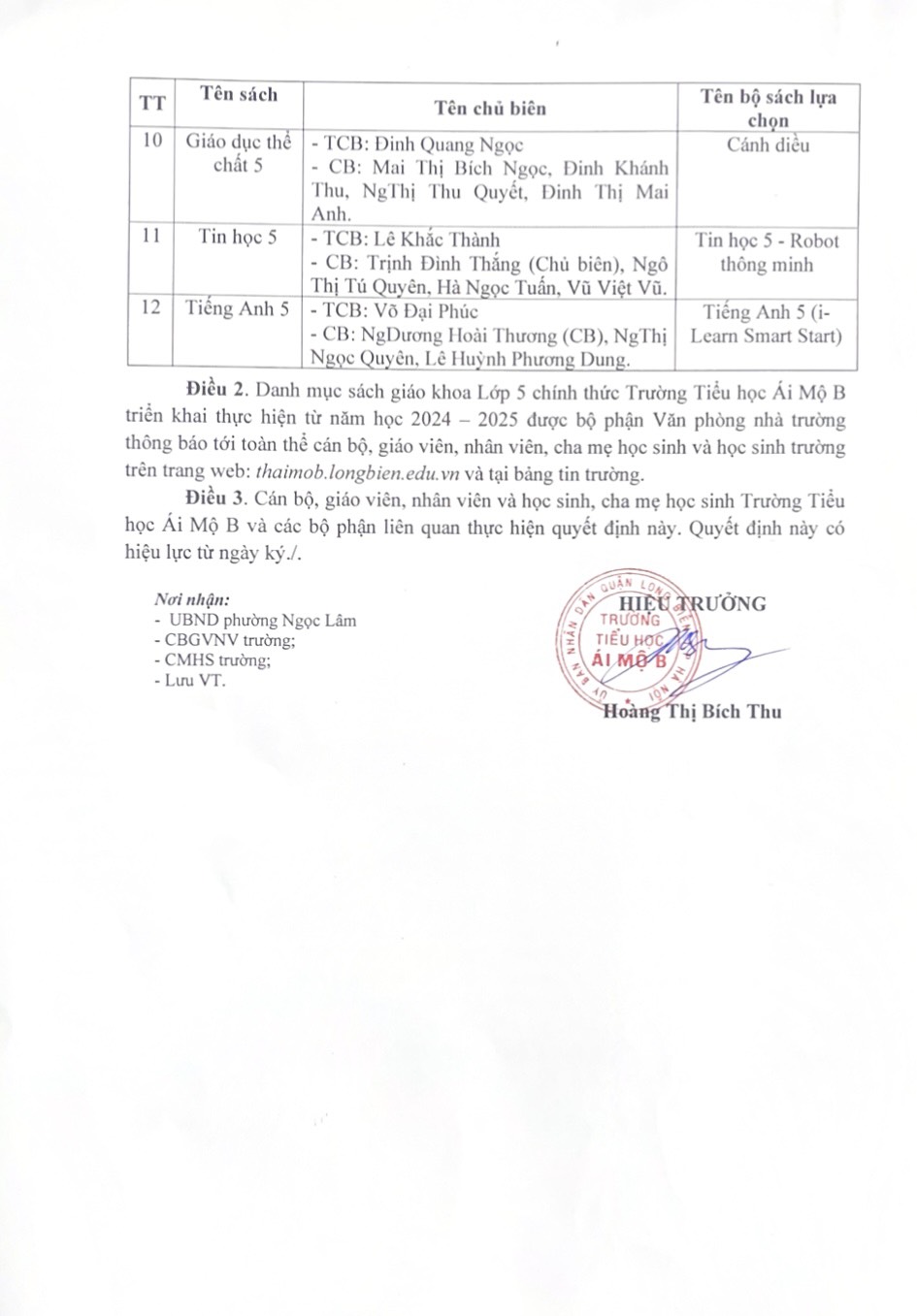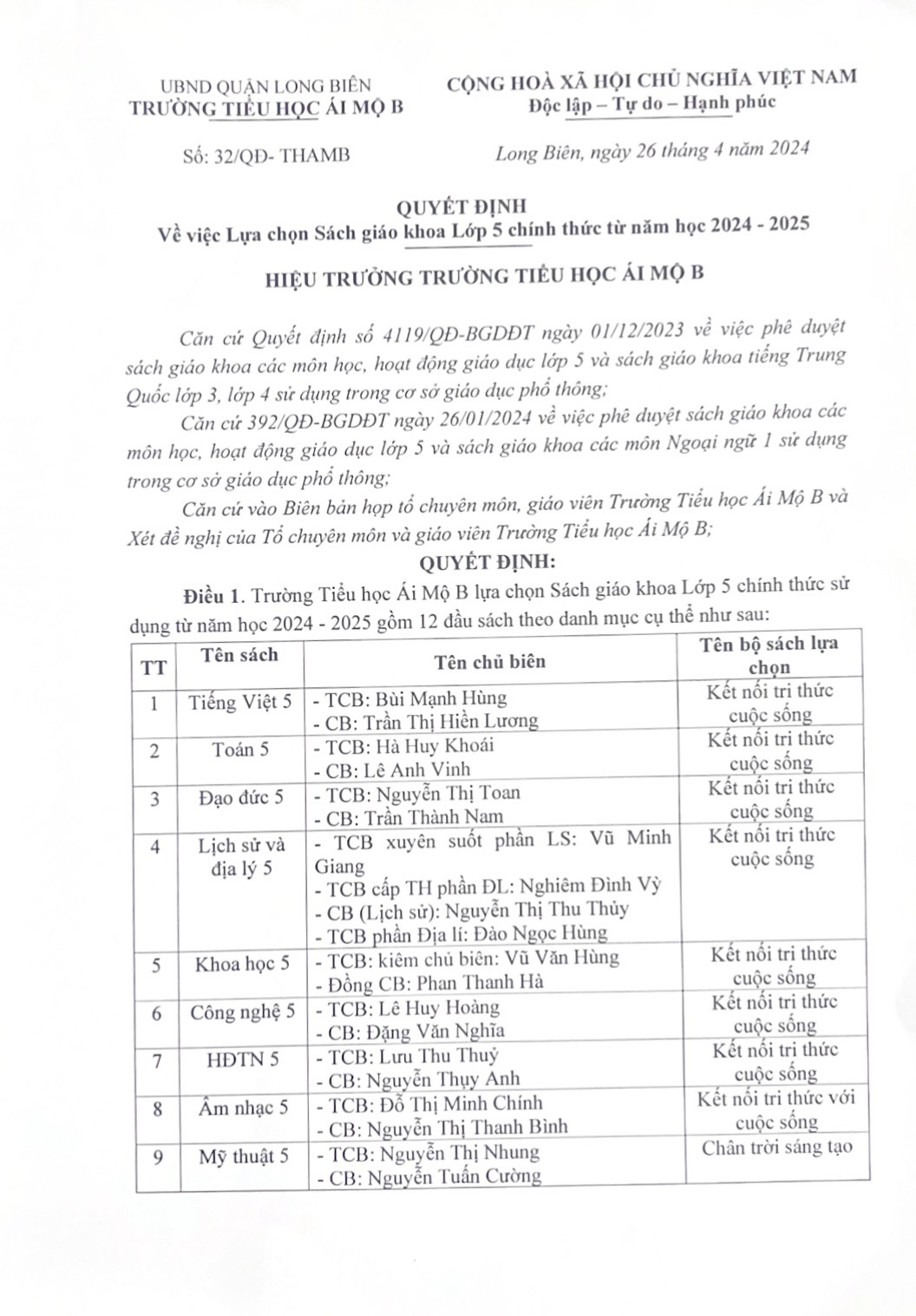 Quyết định về việc lựa chọn Sách giáo khoa Lớp 5 chính thức từ năm học 2024 - 2025