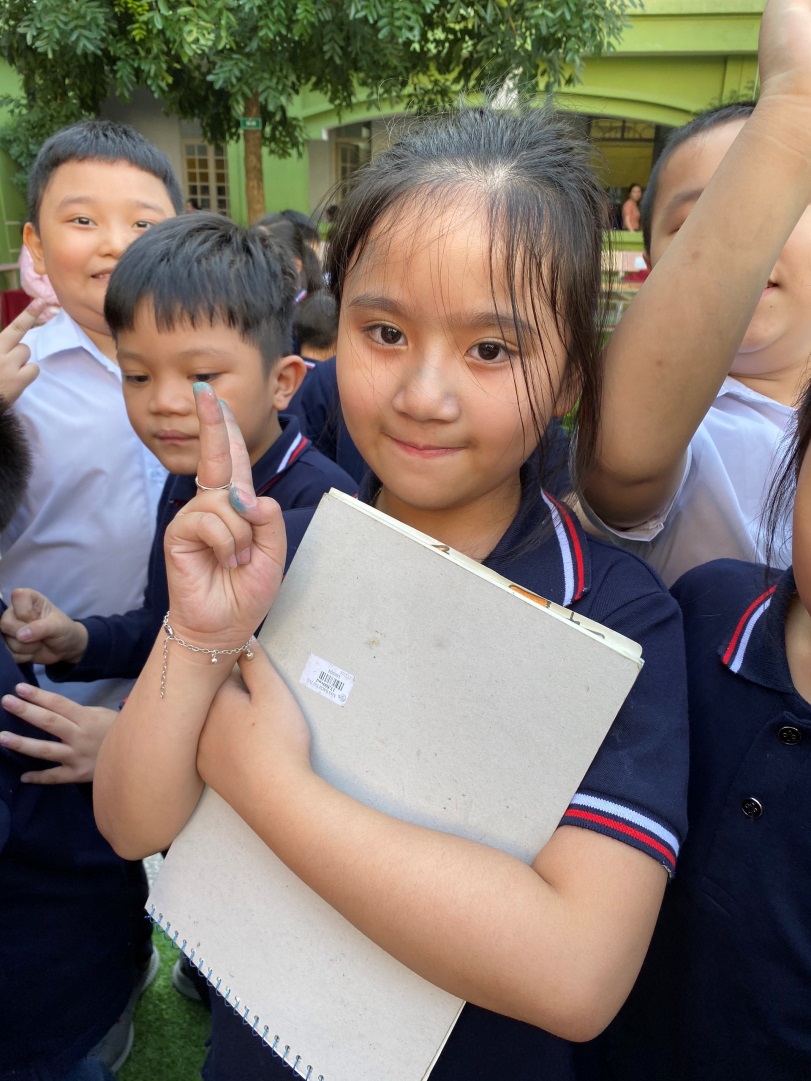 Mai Hạnh trông thật đáng yêu trong bộ đồng phục Trường Tiểu học Ái Mộ B. Mái tóc dài, đen mượt được tết gọn gàng, điểm thêm một chiếc nơ màu hồng càng thêm xinh xắn. Khuôn mặt bạn bầu bĩnh, đôi mắt to, tròn, đen láy ánh lên vẻ thông minh, nhanh nhẹn.