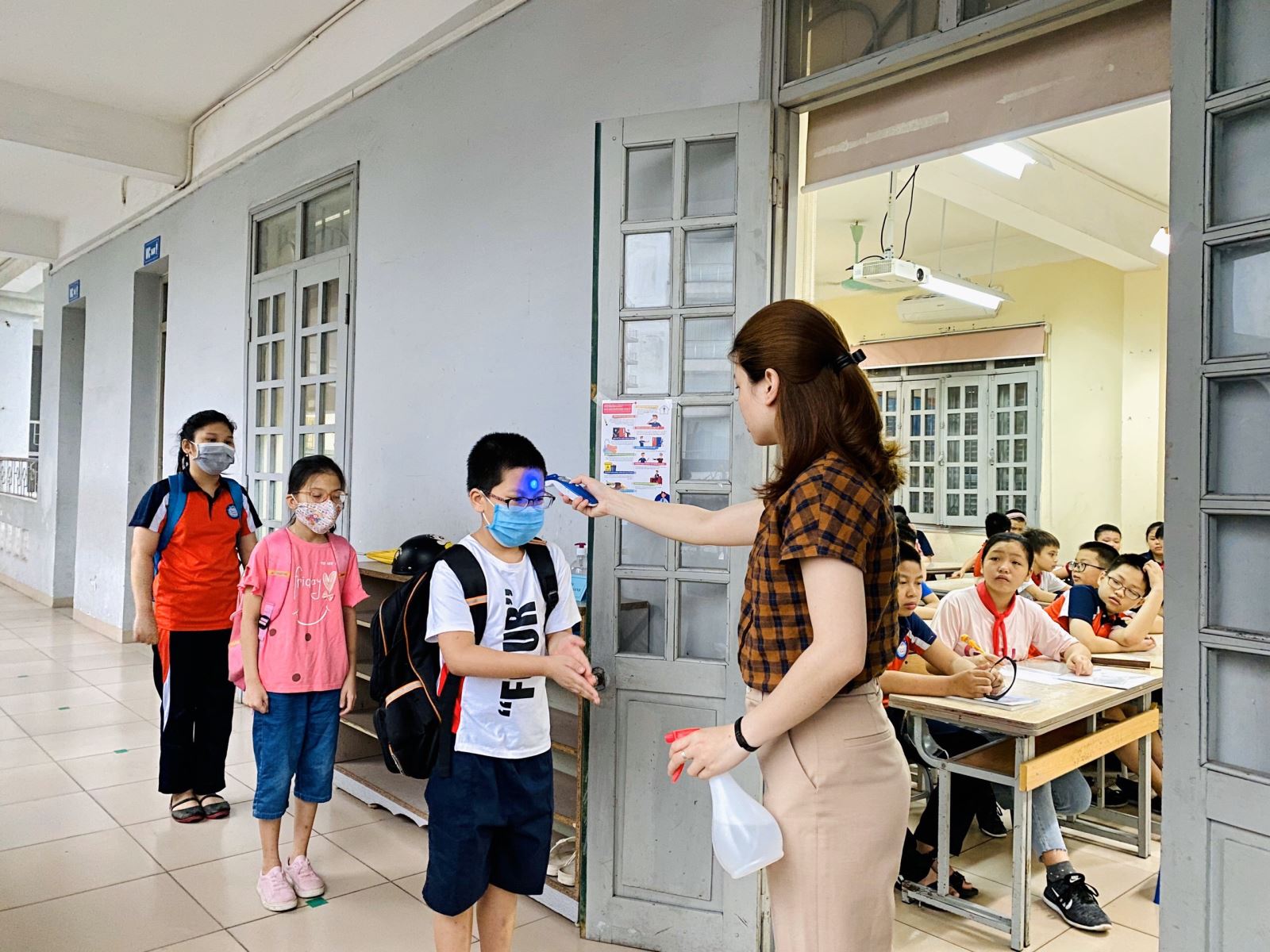 Hình ảnh: Kiểm tra thân nhiệt của học sinh trước khi vào lớp