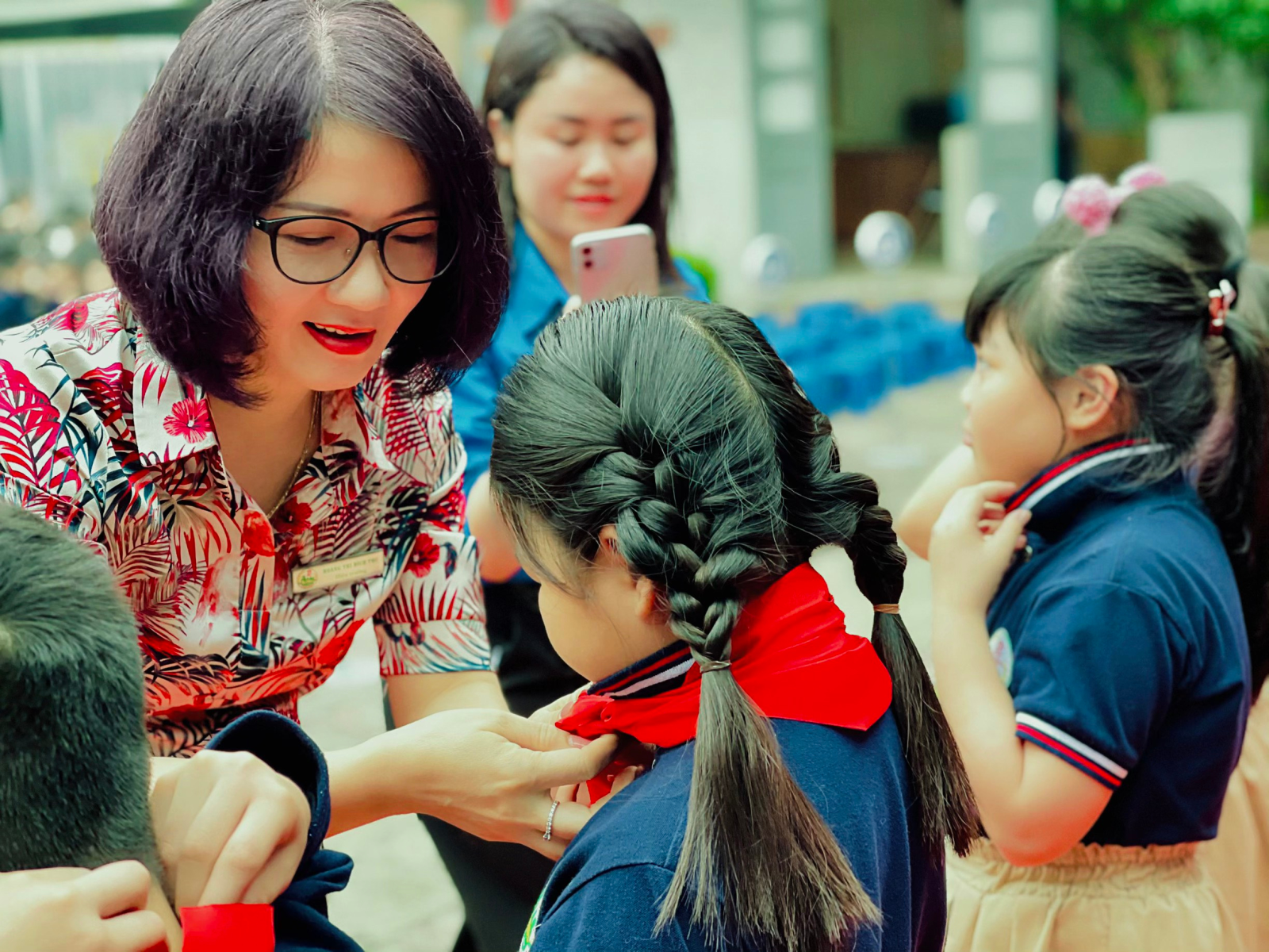 Buổi lễ kết nạp đội viên mới diễn ra theo đúng nghi lễ Đội. Tất cả 152 bạn học sinh tiêu biểu chính thức được cô giáo Hiệu trưởng, Phó hiệu trưởng, cô Tổng phụ trách đội trao và đặt lên vai những chiếc khăn quàng đỏ - một phần của lá cờ tổ quốc, niềm tự hào về đội viên TNTP Hồ Chí Minh.