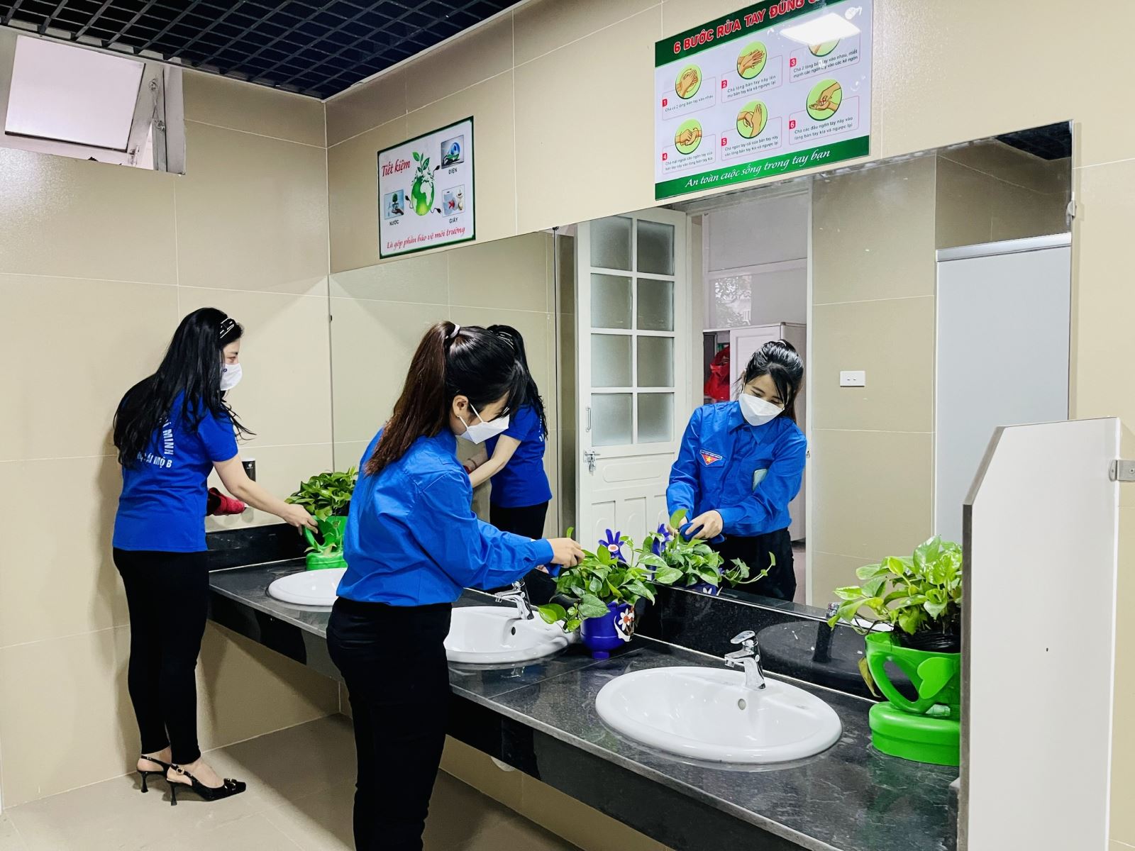 Nhà vệ sinh luôn đảm bảo thoáng mát, đủ ánh sáng, đủ nước, giấy vệ sinh, dung dịch nước rửa tay và lối đi sạch sẽ, sàn không ướt. Hố tiêu, hố tiểu đáp ứng đủ cho số lượng học sinh sử dụng, không có mùi hôi. Bên trong và bên ngoài mỗi phòng vệ sinh được trang trí bởi những cây xanh trồng trong các chậu – sản phẩm ngộ nghĩnh, sắc màu của học sinh trong Cuộc thi “Sản phẩm tái chế thân thiện với môi trường” mang đến không gian xanh mát, tạo cảm giác nhẹ nhàng, khung cảnh thân thiện.